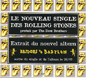 The radio stations across the world started to play the new Rolling Stones single Anybody Seen My Baby on Friday night Aug. 29. It was available for download on the internet the day after, a complete RealAudio version from the KMTT Live radio station. It's great, great, great - slow, but just listen to those guitars, and to the beat - it's a hit! The official release of the new single is set to September 22 in Europe and Sept. 23 in America, i.e. one week before the release of ther new album Bridges To Babylon, and right on the start of the new world tour in Chicago.