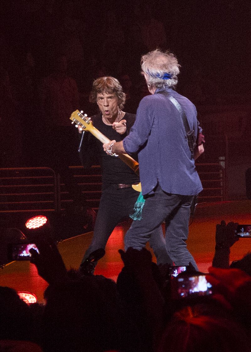 I initially had some concern whether the City of Angels� obsession with celebrity would surpass the music, when before the show everyone suddenly stood up as if the Pope or Queen had entered the room, and then pointed their cell phone cameras at�Jack Nicholson. The actor�s reputation as the number one fan of the Los Angeles Lakers basketball team played nicely into a few jokes by Mick Jagger. Jagger apologized for any inconvenience to fans because tonight�s show was moved from May 2 to May 3 due to the NBA playoff schedule, adding, �We know it didn�t matter for Jack Nicholson because he would be here either way�. Later Jagger poked fun at the often-criticized advanced age of the Lakers, saying about the Stones, �We�re just here to make the Lakers look young�. If there is any question whether L.A. is still a Lakers town, the answer was easily seen by sales at five merchandise stands I checked: Lakers themed concert shirts were sold out, while Clippers (the arena�s other basketball team) and Kings (L.A.�s reigning hockey champions) shirts were still available. The L.A. crowd did prove to be great, standing throughout the show and welcoming the two new songs and rarities. A highlight was the thunderous and sustained ovation after Keith was introduced, to which he responded by growling a simple three-syllable exhibition of his trademark style and cool: �HEY L.A.�.