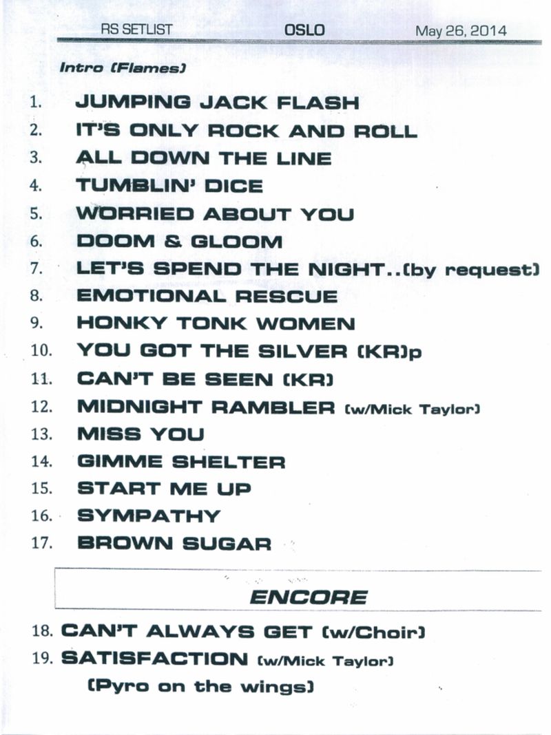 After Doom And Gloom we got the web choice: Let's Spend The Night Together; Jagger commented: " At least one we know" The crowd loved it and also the many Norwegian words Jagger spoke the audience during the entire show.