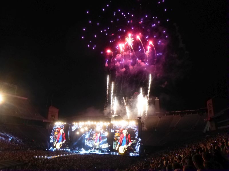 Fireworks flairs closed the show, but sadly, there was no confetti or imitation rose pedals, sprayed onto the audience during Satisfaction, a deletion that the Stones should really reconsider, as that closing element is really a Stones tradition, beginning at least as early as 1972, with Mick throwing rose pedals into the crowd at MSG.