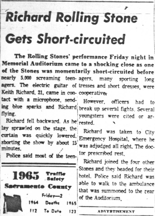 Sacramento Dec. 3, 1965: The Rolling Stones did 2 shows that night, at the 3800 seats Memorial Auditorium. Twenty minutes into the 2nd show, during "The Last Time" a "blue lightning bolt" zap Keith when he was about to sing the backing vocals and he goes down to the ground! The show was shortened by about 15 minutes, as Keith was taken to the hospital. But he recovered fast, and had no problems performing in San Jose the day after!
