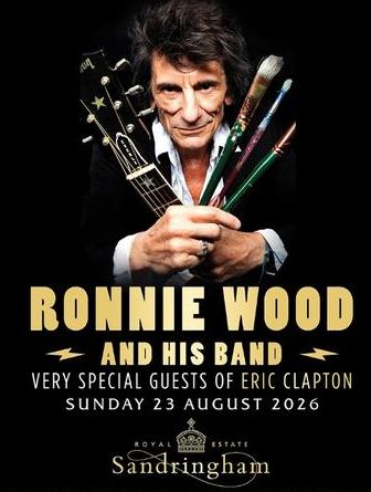 Ronnie Wood will perform a rare solo show with his own band at Heritage Live Sandringham UK Sunday 23 August 2026. The event is headlined with Eric Clapton & Special Guests. See the Official Ronnie Wood web site announcement Ronnie to play show with Eric Clapton, and the IORR thread Ronnie Wood at Heritage Live Sandringham UK Sunday 23 August 2026.