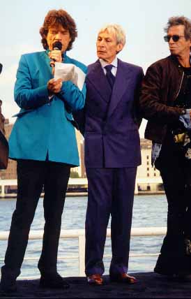 Mick is reading up the support acts of the Bridges To Babylon Tour, while Charlie and Keith is making sure he is doing it right.