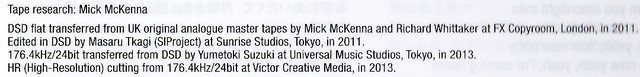 In 2013 DSD files were converted to HR PCM 176.4kHz/24bit and further to standard CDDA 44.1kHz/16bit using a procedure that is called in the booklets 'HR (High Resolution) cutting from 176.4kHz/24bit at Victor Creative Media' (whatever it means, no details revealed).