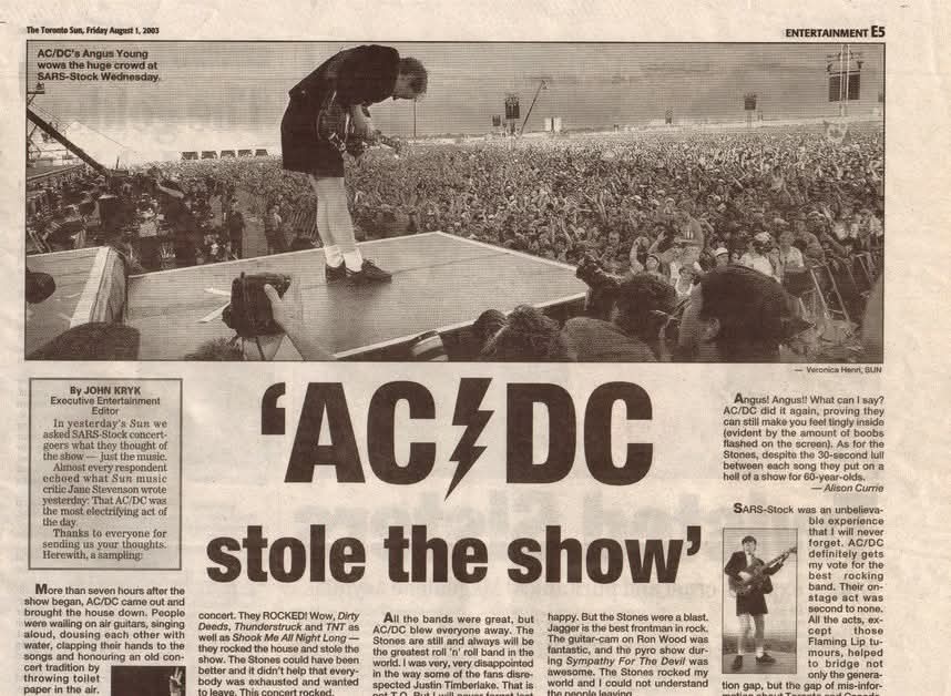 AC/DC blew the Stones out of the water. Angus Young played amazingly and he was mesmerizing. The Stones came on and their body language was all wrong. They made it look like they were dragged into doing the event. They played a shortened set. The energy was just not there.