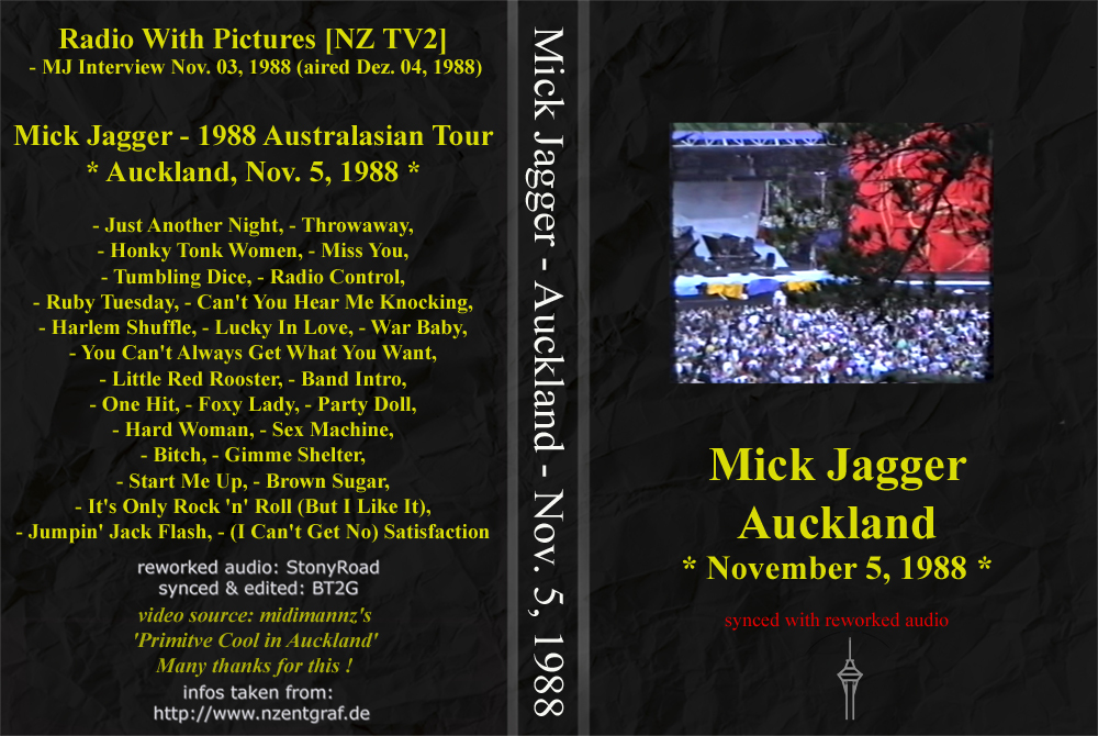 New Zealand celebrated Guy Fawkes Day in style with spectacular fireworks while Mick Jagger gave his concert on November 5, 1988. Due to the noise from the fireworks, sound recordings were more difficult to make than at most concerts. Nevertheless, there is at least one audio recording of this extraordinary set list and, fortunately, footage of the entire film. I would like to take this opportunity to thank Midimannz for allowing us to use it.