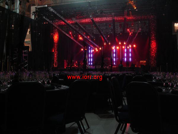 As the dinner was finishing close to 11pm, the guests were told to leave their seats, some tables were moved slightly away from the stage, black curtains were dropped to hide the tables, and this was now soon to become a rock show for some 700 bank people that were lucky to be connected the right way for this arrangement.