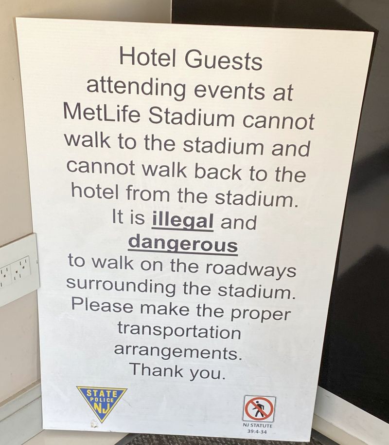 I stayed at what must have been a one star hotel "Super 8" out in a place called Carlstadt, which is right next to the Metlife Stadium, less than a mile, but due to all the roads in the area, it is 1.3 mile walking in unsafe areas among cars, parking lots and so on. I did the walking in 2019, for the shows then, same hotel, same venue, but when I arrived to my hotel this time around, there was a big sign in the reception saying it was illegal and dangerous to walk to the stadium, signed the police and the authorities. So I took the next door shuttle from Redd's bar and rstaurant, it took 3 minutes to the show, six minutes back after the show, you can not beat that.