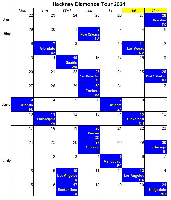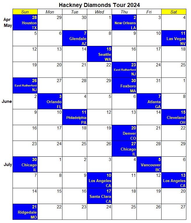 Nov 17: Rumoured shows added for Houston, New Orleans, Glendale/Phoenix, East Rutherford NY/NJ (2x), Foxboro/Boston, Philadelphia, Chicago, Los Angeles (2x), Santa Clara/San Francisco.