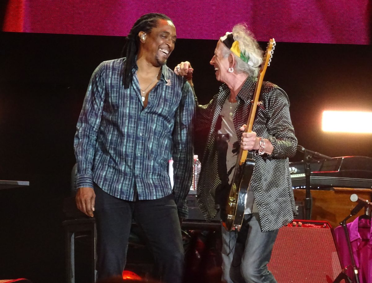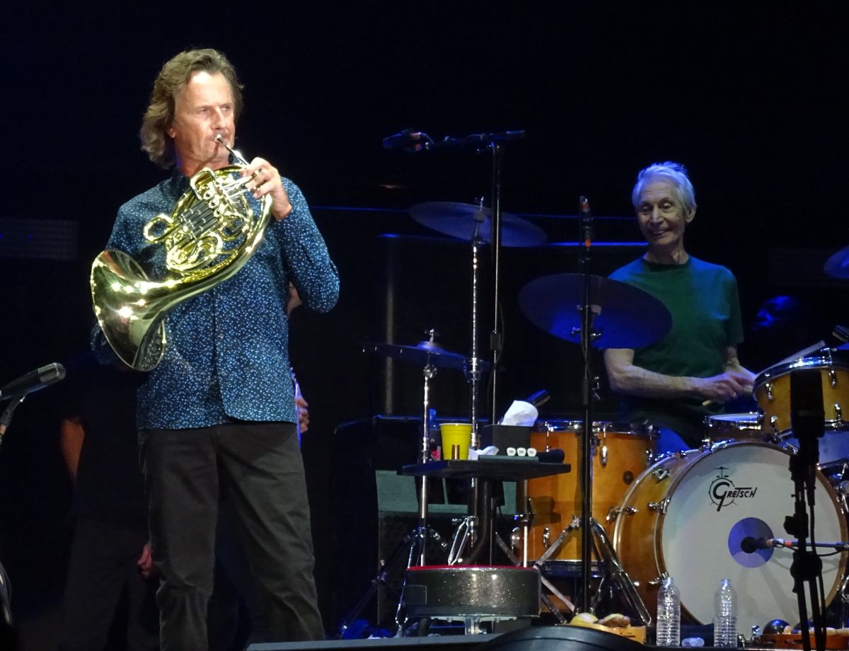Matt Clifford was at his keyboard for the entire show, completing one of the most amazing comebacks in rock 'n' roll history. The only time I heard him was when he shook lots of little percussion instruments on "Brown Sugar" - and I swear he made the song sound pretty cool. In some ways he made more of a difference on that song than Bernard and Sasha did during the entire gig. Alas, his mike failed during his spotlight on "You Can't Always Get What You Want," so he just stood there blowing into his French horn to no avail. Mick and Keith looked a little vexed, but kept their eyes on the audience. I'm sure Chuck got some Schadenfreude.